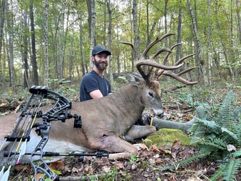 When he began following the sign, red spray on both sides of the trail confirmed the double-lung shot Casey had suspected. The deer covered only 65 yards before expiring.